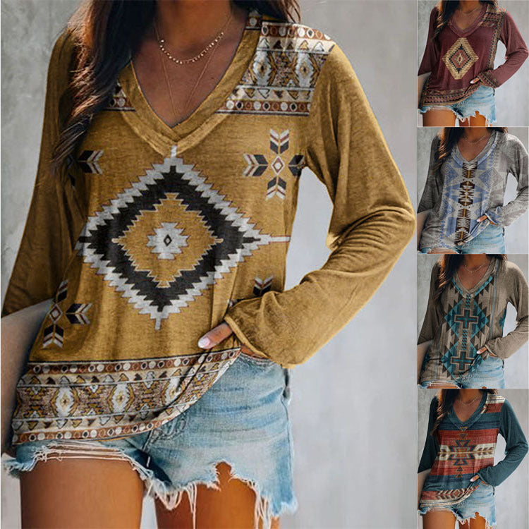 Women Ethnic Style Printing Long Sleeved V- Neck T-Shirt
