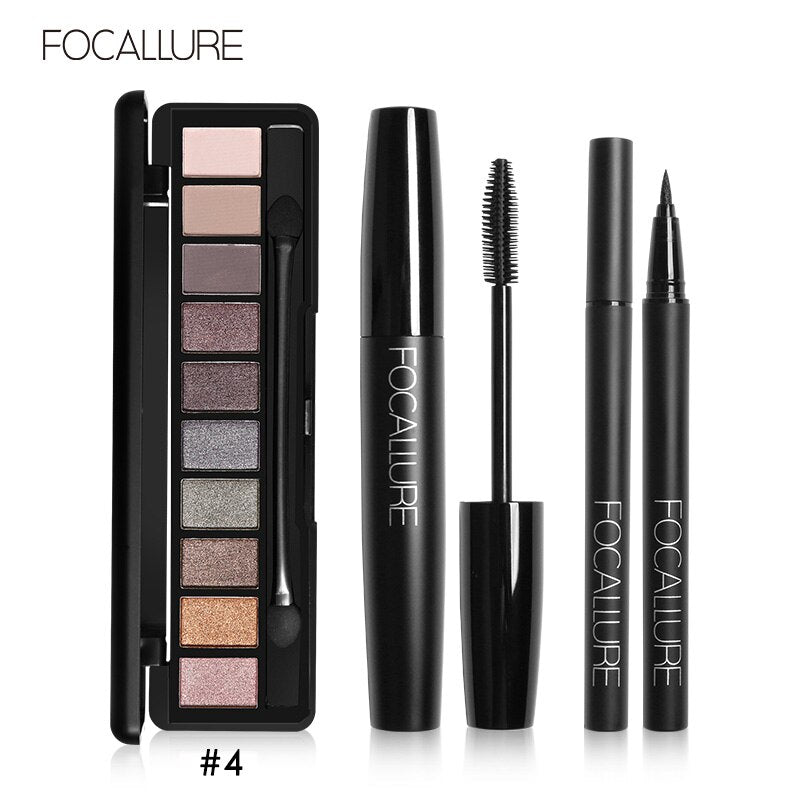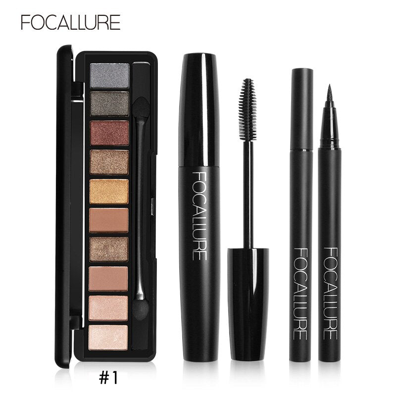 FOCALLURE 3PCS Eye Makeup Set Waterproof Eyeliner Long-lasting Mascara Professional Eyeshadow Palette Pigment Cosmetic Kit