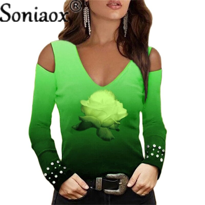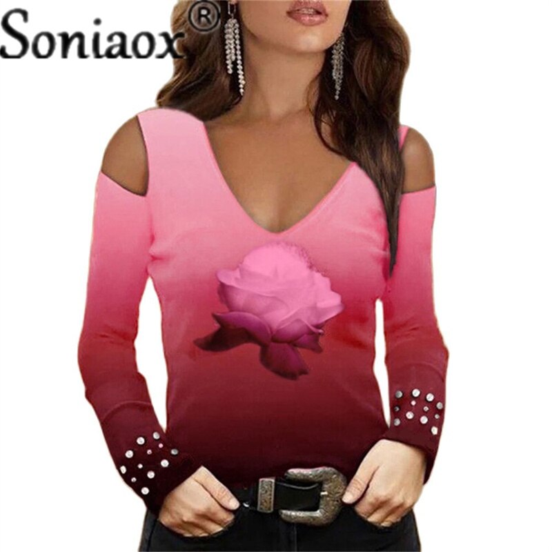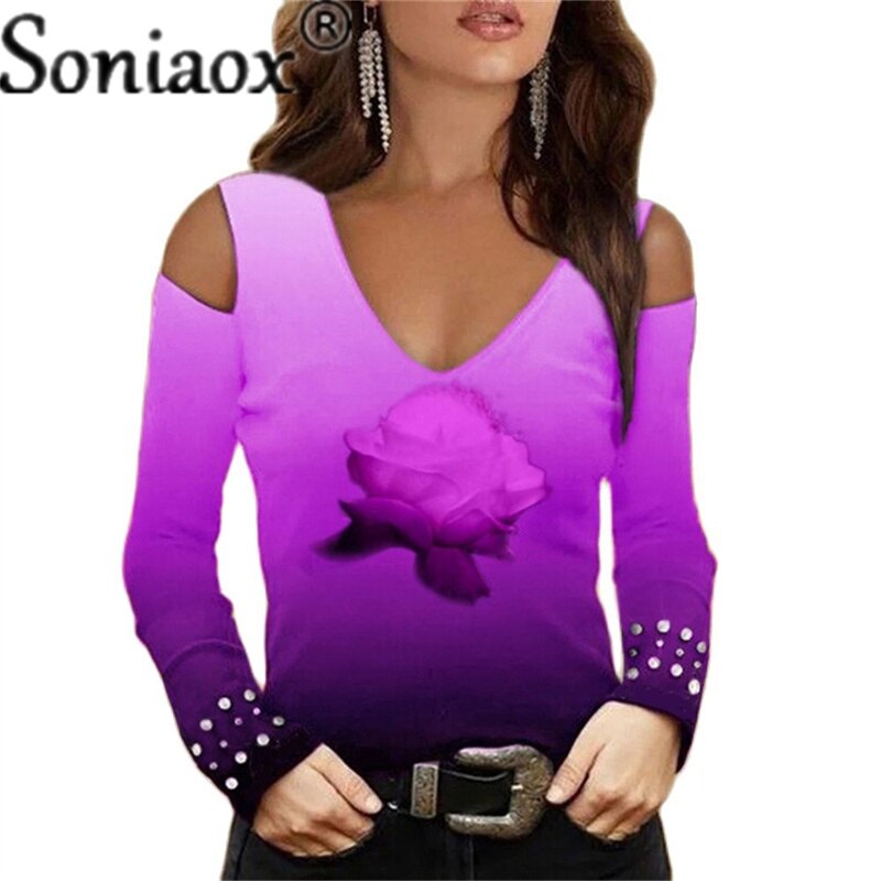 Fashion V-Neck Off-Shoulder Flower Print Top.